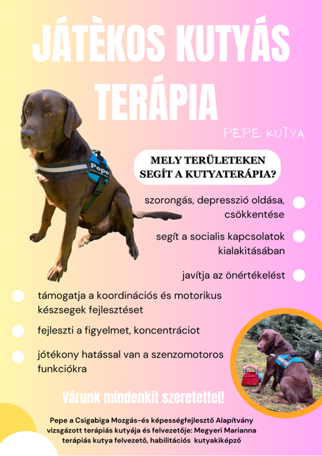 11:00 – Kutyaterápiás foglalkozás: ismerkedés Pepével, a terápiás kutyával, sok simogatással és közös élménnyel, játékkal, önizalomerősítéssel, stresszoldással